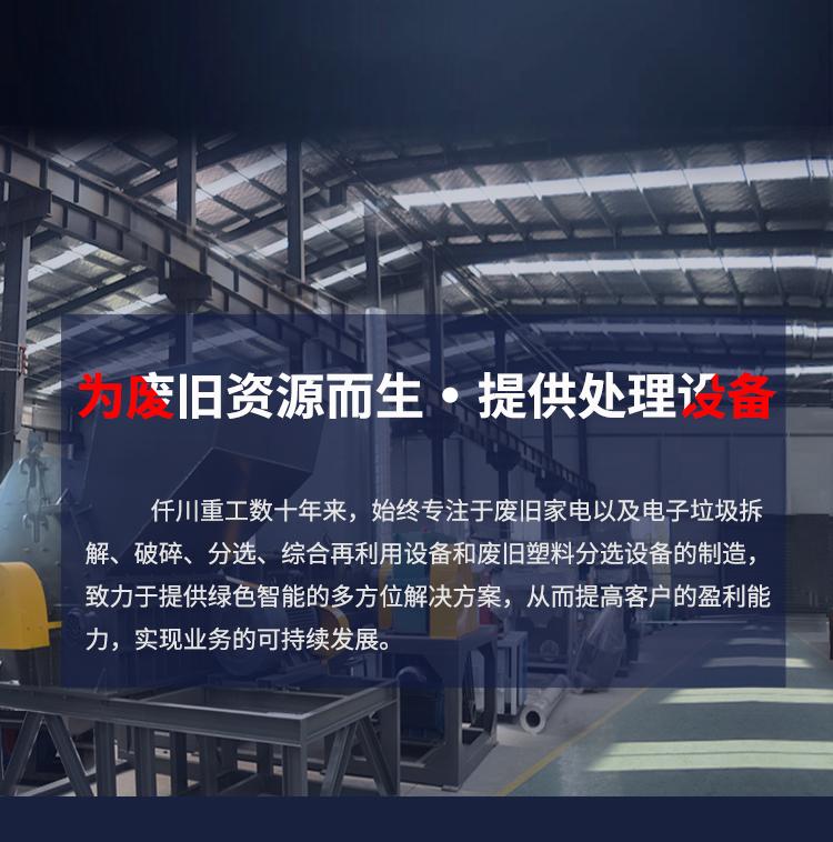 仟川重工數(shù)十年來,始終專注于廢舊家電以及電子垃圾拆解、破碎、分選、綜合再利用設(shè)備和廢舊塑料分選設(shè)備的制造,致力于提供綠色智能的多方位解決方案,從而提高客戶的盈利能力,實現(xiàn)業(yè)務的可持續(xù)發(fā)展。